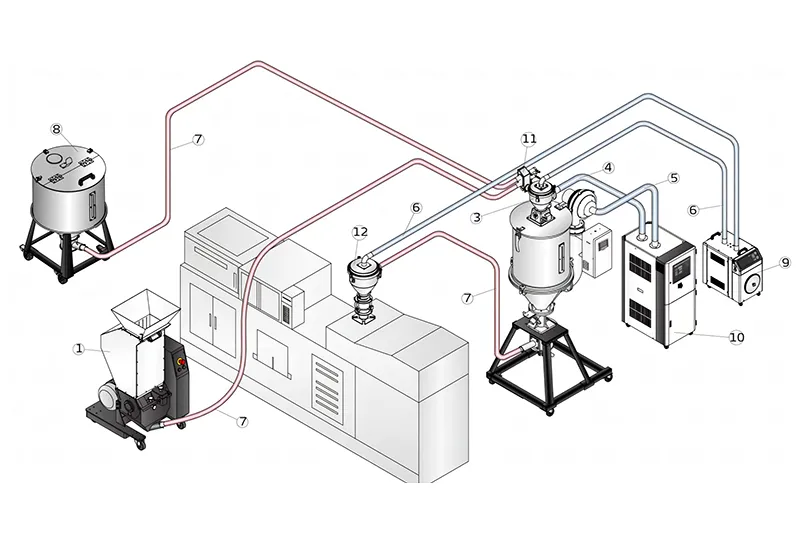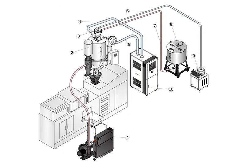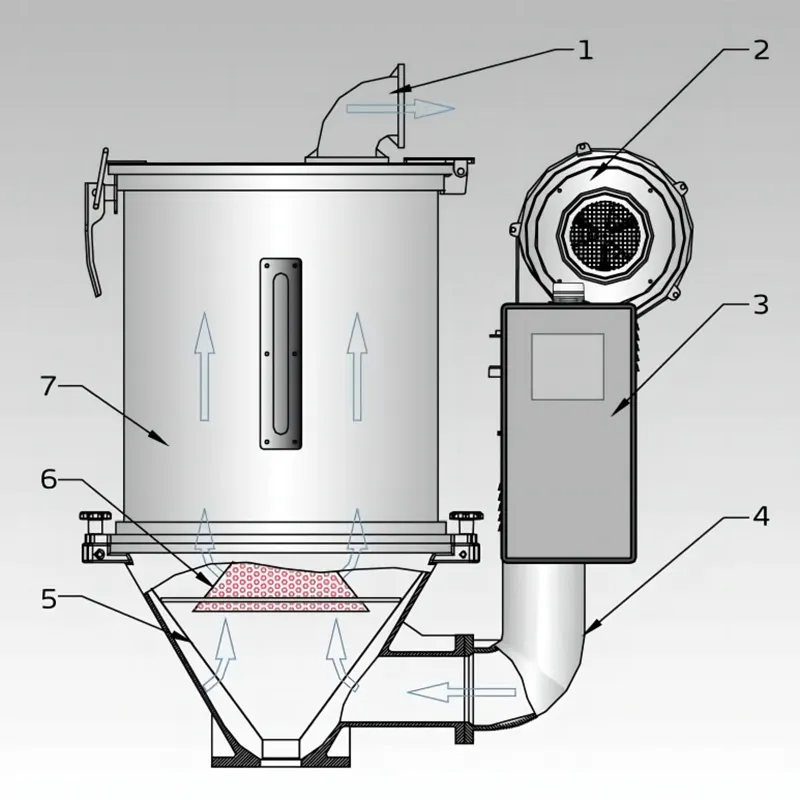ホッパードライヤーと組み合わせることで、熱風が半閉鎖循環回路を形成します。この熱風回収装置は以下のような特徴があります。