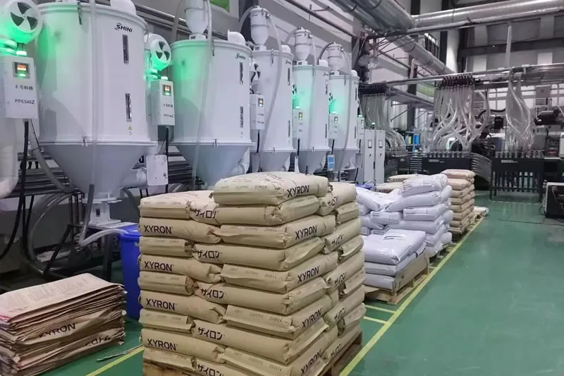 お客様は4列88台の射出成型機があり、型締力は160t~260tである。 処理する原料は主にPA、PPO、PPE、一部のガラス繊維強化コンパウンドなどがあり、主に太陽光発電エネルギー製品生産に使用されます。
